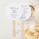 Wedding day ceremony program on a round style hand fan that features a white background with the bride and groom names and date on front side of fan, along with dark gray, stylized script listing the wedding party participants and ceremony rites on back side of fan. Edit hand fan and replace names and info with your own wedding program info. Perfect for a summer, outdoor wedding venue! Select number of hand fans desired.