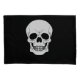 A grinning white skull head silhouette on a black background color. Eerie design to decorate for Halloween time, for example.