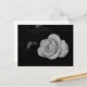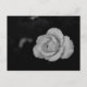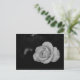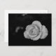 High angle view from one small white rose blossom on black background, good for black and white monochrome greeting cards with free space for customizable text.