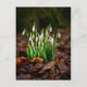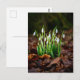 This postcard features a photo of white snowdrops in the forest.