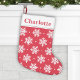 Christmas stocking features a two-sided red design (color can be customized) with white winter snowflake and dots pattern. Personalize the custom dark gray script text with a family member's name.