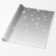 Fun and festive wrapping paper features white snowflakes on a silvery gray gradient background.