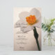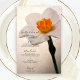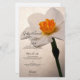 Customize the pretty White Spring Daffodil Wedding Menu with the details of the meal that you will serve at your March, April or May garden party bridal shower luncheon, post wedding brunch or marriage reception dinner by adding the salad or first course, entree or second course and dessert or third course. This elegant custom flowery nuptial menu features a floral photograph of a white narcissus flower blossom with an orange center on the stem with a beige background