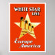 Vintage ocean liner poster for White Star Line's transatlantic steamships connecting Europe and America. Illustrated with the four smoke stacks of the Titanic's sister ship Olympic bursting through a star cut out, 1920's.