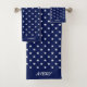 Elegant white star pattern on navy blue Bath Towel Set. Name text can be personalized.