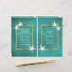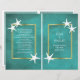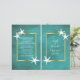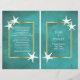 White starfish on teal stained grunge paper modern folded booklet style beach wedding ceremony and party program featuring a gold frame on dark aqua teal blue background and white starfish on the corners. This elegant summer wedding design is part of a wedding set or collection and is a totally customizable template perfect for a beach destination summer wedding. You will have to fold in the center to have a folded program. Choose only the value paper type as it folds well.