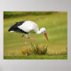 Closeup white stork (Ciconia ciconia) standing on grass, a raised leg, looking for food near of pond