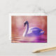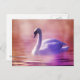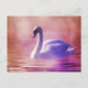 A charming whimsical fairytale image. Soft romantic photo of a white swan cast in purple lighting swimming on a misty lake. Colorful purples and pinks create a mystical magical mood.