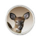 This lapel pin features a gentle brown white-tailed deer looking right out at you from his hiding place in the woods. His big ears are alert. The face has white markings around the eyes and nose. The image is set on a bronze gradient background.