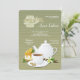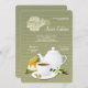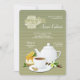 A tea party invitation featuring a white teapot, cup and saucer, next to an orange topped cheese cake. (<a href='https://www.freepik.com/free-vector/tea-party-poster_1530872.htm'>Designed by Freepik</a>). <br/><br/>The card is easy to customize with your wording, font, font color and choice of six paper types.<br/><br/>Not exactly what you're looking for? All our products can be custom designed to meet your needs at no extra charge.<br/><br/>Simply contact us at askcottonlamb@gmail.com<br/><br/>Coordinating products available: