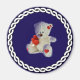 White Teddy Bear, oh so cute, on navy blue solid color, white braided circle frame.