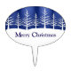 Christmas cake pick with white pine tree silhouettes on snowy hills against a midnight blue sky and "Merry Christmas" greeting.