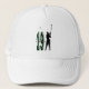 Style: White Trucker Golf Hat with female silhouette golfer next to hole 19 for celebration.