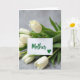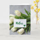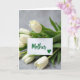 Designed with a calm still-life look, this card features a generous cluster of creamy white tulip-like flowers, some still closed and others gently opening as if leaning toward one another in quiet affection ❤️. Soft, diffused light falls across the petals, bringing out delicate folds and a faint yellow glow near the centers. Deep green leaves cradle the blooms, creating a cozy, intimate nest around the main focal point. Tucked among the flowers is a crisp rectangular card, angled slightly forward so it feels like it was just placed there by a caring hand. Near the center of the card, a single word appears in flowing green lettering, with a small green heart symbol close by 🌼. The muted, mottled gray background stays understated, letting the white petals and green details stand out. The card’s edges are sharp and bright against the surrounding foliage, and the green text sits neatly on the white surface with the tiny heart just beside it.