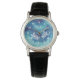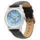 This personalized women’s watch features two stylized tribal turtles set against a dreamy blue gradient background, inspired by ocean waves and island art. A customizable monogram adds a personal touch, making this a thoughtful gift for sea lovers, surfers, or anyone drawn to coastal aesthetics and symbolic turtle imagery. The elegant black leather strap and silver frame give it a classic, wearable style for everyday or vacation wear.