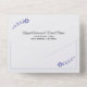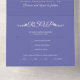 Modern white typography and small flowers on periwinkle blue background all in one wedding invitation. It displays your names in a cursive script elegant style typography and two small white flowers with leaves on both sides of the ampersand on blue. The tear off RSVP can be detached.