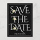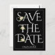Elegant white typography and rose black wedding Save the Date postcard. It includes the phrase "Save the Date" in a decorative relief font in white, the date of your wedding and a white border on black background on the front. The back showcases details of your wedding.