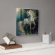 Beautiful white unicorn with golden horn and color mane and tail with a mysterious forest in the background.