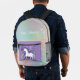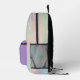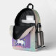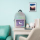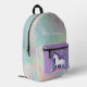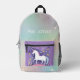 A backpack for that in between time when one is big enough for a big backpack, but still fanciful in thought. This design has a white stepping unicorn on the violet color pocket with stars. The surface is a pastel gradient gradient sky with white starbursts, and the bottom is a darker pink color complementing the pink on the bottom of the unicorn pocket. Personalize as you wish. These are very good bags, and it is good to have a printed identification, I think. But I am putting children's surnames on outerwear. You can instruct your child to answer to their first name only to prevent strangers from calling them by their first name.