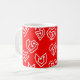 This mug has a mid-century modern Valentine’s design of scattered white heart mazes on a field of red.