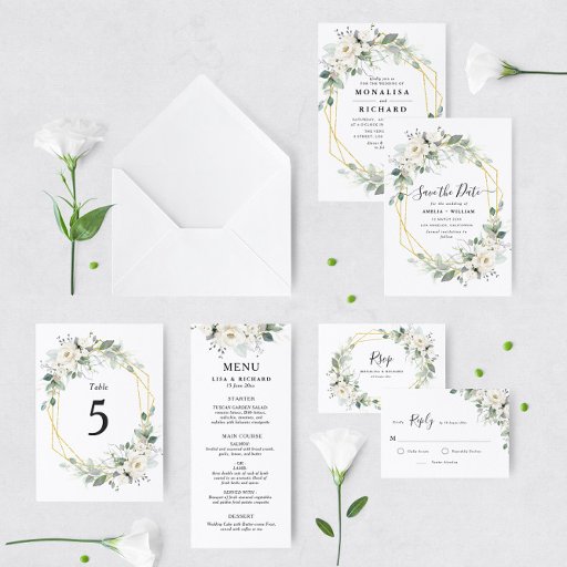 White floral greenery & gold frame wedding suiteDesigned by Tafa Ryan