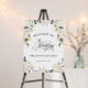 Welcome guests to your wedding with this elegant welcome sign featuring watercolor bouquets of white mixed flowers surrounding your text. Beautiful calligraphy script spells out the word "Wedding" in elegant style. Personalize the text template with the bride and groom's names and wedding date. This sign is available in a variety of sizes to suit your needs and can be placed on an easel or attached to a wall or flat surface.