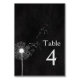Bold white dandelion on textured black background with floating seedlings for wedding table number.