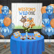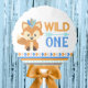 Tribal Forest Fox Wild One First Birthday Balloon Decoration Centerpiece. Featuring shades of blue, orange, tan and brown.