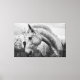 A beautiful wild-spirited white horse with a vintage inspired black and white design.