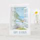 open white window and sheer curtain with young child walking on ocean beach scene for birthday