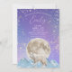 This custom party invitation features a majestic wolf theme. The background features a gradient blue, purple, and pink sky that resembles the northern lights in the cold north winter. Twinkling stars surround the text portion. A white wolf is pictured roaming through snow covered mountains. Blue glitter accents the snow. A large full moon is pictured in the distance.