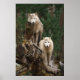 In a serene forest, two white wolves stand on a fallen tree stump, their fur muddied by recent rain. Despite this, their presence commands attention, exuding strength and grace as they survey their domain with alert eyes and poised stances.