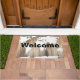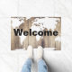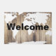 White world map silhouette over a light rustic wooden planks background. The world welcome is in black bold and thick letters. This doormat is great for the well traveled family!
