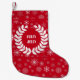 Cute white wreath and white abstract snowflakes pattern over red background- Holly Jolly. Customizable stocking template
