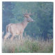 Whitetail deer poses at edge of a summer forest, making a dramatic profile against the trees. Sturdy ceramic tile can be inspiration for many nature decorating projects!