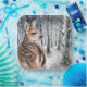A whitetail fawn with a spotted coat stands in a snowy forest, surrounded by bare trees and softly falling snowflakes