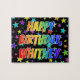 This exciting and fun birthday-themed jigsaw puzzle design features the message "HAPPY BIRTHDAY, WHITNEY" with the characters having a colorful rainbow spectrum inspired gradient pattern, in addition to a lively star shapes background pattern. A colorful puzzle like this might be used to send birthday wishes to somebody named Whitney. [~Z0000468]