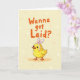 Designed with a sweet, cheeky twist, this card features a round little baby fowl in soft bright yellow standing near the bottom, looking up as if it’s waiting for a friendly reply 🐰. It wears a simple headband with tall bunny ears, the tips lightly blushed pink, which adds a dress-up feel that reads like a gentle flirt. Small dark eyes and a tiny orange beak give it an eager expression, while matching orange feet anchor it in place. Above, across the upper two-thirds, a large question is written in thick, casual orange lettering that leans slightly like a quick note. The spacing leaves plenty of air around the words, so the line feels direct while the little character below makes it feel teasing and affectionate. The background is a creamy pale yellow with scattered soft circles in peach and cream, like a light confetti haze 🌷. A few of the circles fade at the edges, creating a warm, dreamy depth behind the orange text and the bunny-eared chick.