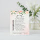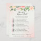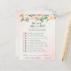 This baby shower game card features beautiful soft pastel watercolor roses and peonies in shades of blush pink and peach with lush green botanical leaves and eucalyptus.