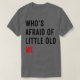 Whos Afraid of Little Old Me TShirt 15 .Funny, Family, Sports, Music, Education, Animals, Jobs, Names, Graphic, Tees Shirt, Funny Sayings, Vintage, Holidays, Gifts, party, souvenir, pride, vacation, clothing outfit apparel gift for Father's Day, Christmas, Birthday, Mother's Day, Anniversary, Graduation, Halloween, 4th of July, Retirement, St. Patrick's Day, Thanksgiving.