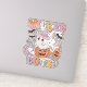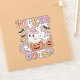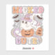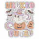 Wicked Cute design features colorful text of melon, white, yellow, lavender, and pink that reads Wicked Cute and has a ghost with a witch hat, jack-o-lantern pumpkins, and little bats flying around! This Wicked Cute Halloween design is great for both kids and adults alike!