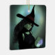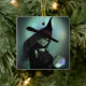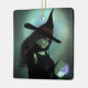 A smiling witch dressed all in black wearing a tall black hat casts a glowing orb spell.