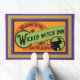 A festive Halloween message welcomes with flair: “Welcome to the Wicked Witch Inn – Stay For A Spell.” The design features a flying witch silhouette, a delicate spider web, and playful typography that blends spooky charm with whimsical hospitality. A vibrant border in purple, green, and orange frames the composition, adding a splash of seasonal magic to the witchy theme.