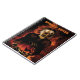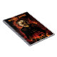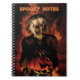 Wicked witch holding a pumpkin. Flames in background. Orange and black colors. Spooky Notes text can be customized by you.