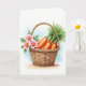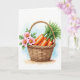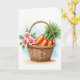Designed with a rustic woven basket as the centerpiece, this card features a generous pile of bright orange root vegetables with feathery green tops spilling upward. The warm tan weave of the basket is drawn with fine detail, giving the scene a cozy, close-to-home feel that suits a note between friends or a sweet spring hello. A small cluster of three soft pink blossoms with sunny yellow centers drapes from the handle, like a gentle gift tucked in for someone special 🌷. Behind it all, a pale wash of blue and white suggests open air and a calm day outdoors, keeping the focus on the harvest. The greeting text sits near the top in a light, spring-ready color, with smaller wording placed below in a matching tone for balance 🐰. Subtle shifts in the orange shades make the vegetables look freshly gathered, while the greens add lively contrast without overpowering the scene. The basket handle arches over the arrangement, and the pink flowers hang slightly to one side against the airy background.