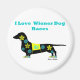 I love wiener dog races in bold teal text above the graphic artwork of a black whimsical dachshund covered in painted flowers, with his racing number on his back and tennis shoes on. Adorable gift for any doxie lover.