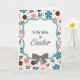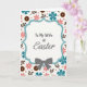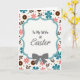 This card features a scalloped white frame outlined in light teal, centered like a little window into spring. Inside the frame, the text reads “To My Wife at Easter,” with “To My Wife at” in a simple, easy-to-read style and “Easter” in a flowing cursive look, all in teal. A neatly tied gray bow sits at the bottom of the frame, like a small gift ribbon that hints at closeness and care. Behind it, a bright white background is filled with repeating five-petal flowers in soft coral and deeper teal, giving the scene a gentle, affectionate energy 🌷. Slender brown leafy sprigs weave between the blooms, adding a natural, garden-like touch that feels quietly romantic. Warm chocolate-colored circles dotted with tiny white centers appear throughout, alongside faint pale pink specks that soften the space 🐰. The teal outline, coral flowers, brown sprigs, and tiny dots spread evenly across the background around the centered frame.