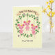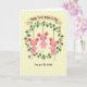 This card shows a sweet digital illustration centered on three small, pink, round-eared cartoon creatures cuddled close together, their gentle smiles and leaning poses suggesting a cozy bond ❤️. A circular wreath of rich green leaves and tiny red berries surrounds them, making the trio feel like the heart of a little celebration. Each creature wears a bright yellow flower on its head, adding a soft, sunny touch against the pale yellow background with faint lighter dots. Near the top, a light banner carries the message “Happy First Mother’s Day” in a darker, easy-to-read color. Beneath the wreath, the line “From your little triplets!” appears in matching lettering, placed neatly to balance the layout. Around the outer edge, a few small gray, rodent-like figures peek in shyly, as if watching over the moment with friendly curiosity 🌼. The overall scene keeps a calm, tender look through rounded shapes and gentle contrast. Tiny red berries and leafy sprigs form a complete ring around the trio, with the little gray onlookers tucked near the sides.