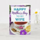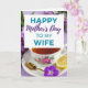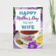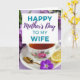 This card features a white rectangular panel across the upper half with the message “HAPPY Mother’s Day TO MY WIFE” centered and easy to read. “HAPPY” and “TO MY WIFE” appear in teal, while “Mother’s Day” is written in deep purple with smooth, flowing lettering, giving the words a tender, romantic touch ❤️. Behind the panel, the background stays softly blurred, like a quiet morning scene shared close together. Below, a white teacup with small pink flowers holds an amber-colored drink, resting on a matching saucer beside a shiny gold spoon. A lemon slice peeks in near the cup, adding a bright little note against the gentle lavender surface. Out-of-focus purple and white flowers surround the setting, suggesting a calm moment meant for two 🌼. In the foreground, a single purple blossom sits closest to the viewer, slightly sharper than the rest.