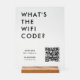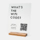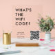 This stylish transparent clear acylic wood block stand tabletop sign provides a clean and modern way for customers or guests to access your wifi network instantly with bold typography quote "What's the WiFi Code?". The design features a central QR code area that can be linked to your wifi details so users can scan to connect without typing a password. Enter your network name and any custom instructions that fit your need. The minimalist layout keeps everything readable which works well for cafes, salons, studios, offices, rental properties, pop ups or event venues. Because the template is fully editable, it adapts easily to branding updates or new wifi information. A practical and polished solution that helps streamline customer access and elevates your in person experience.